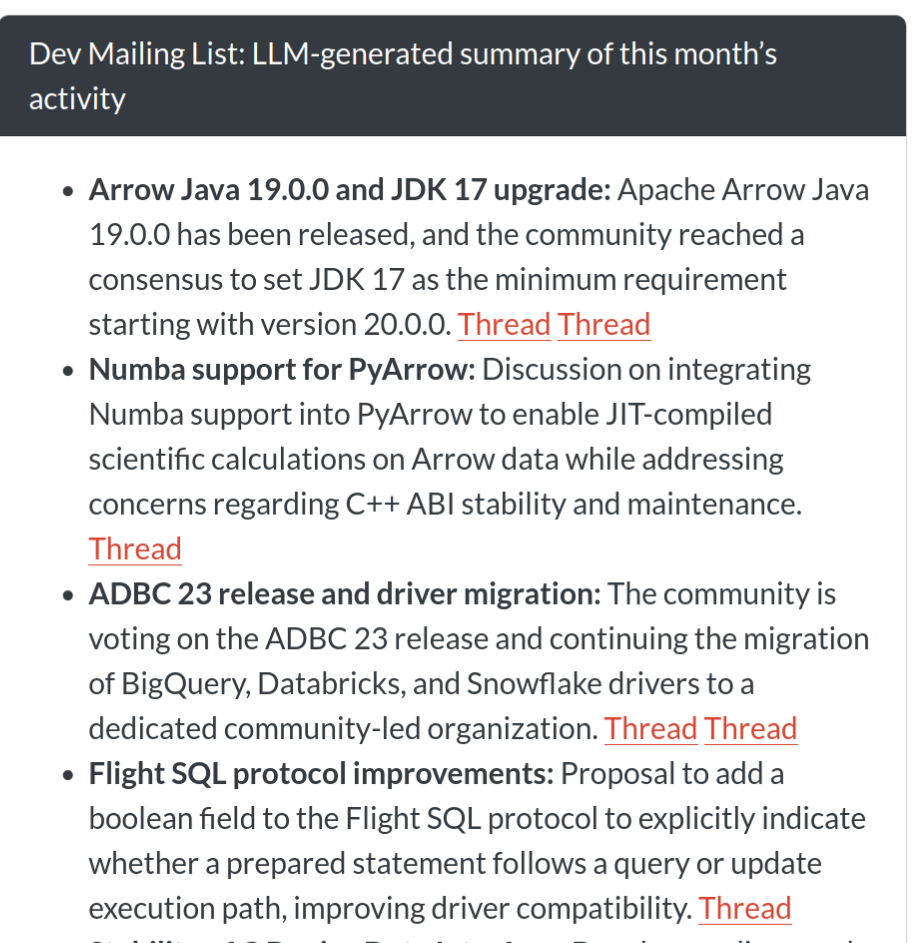We have some code that grabs the Arrow mailing list and works out all the threads and summarises what’s going on in the project. It runs every night, so it’s a single LLM call once it has the relevant data.