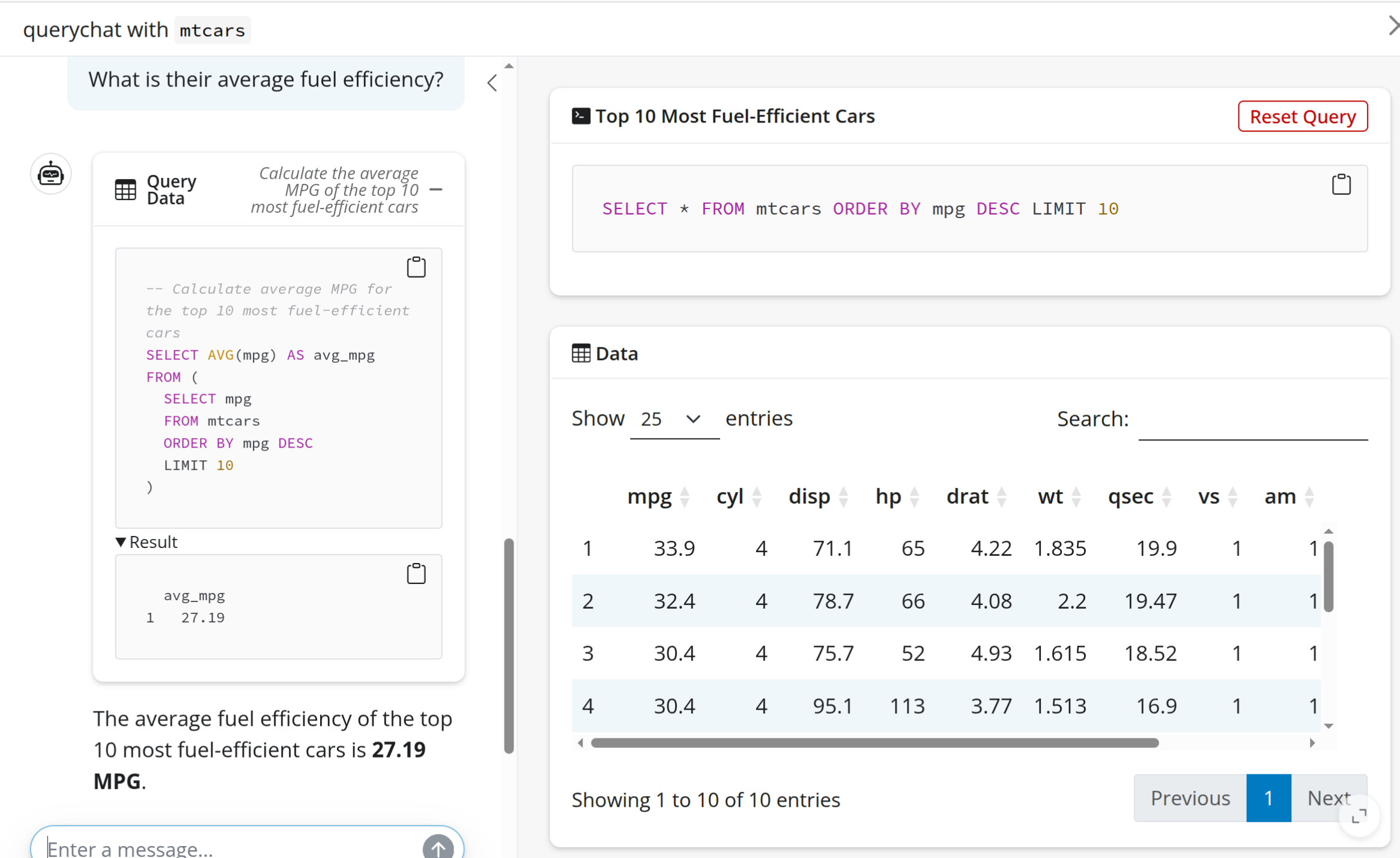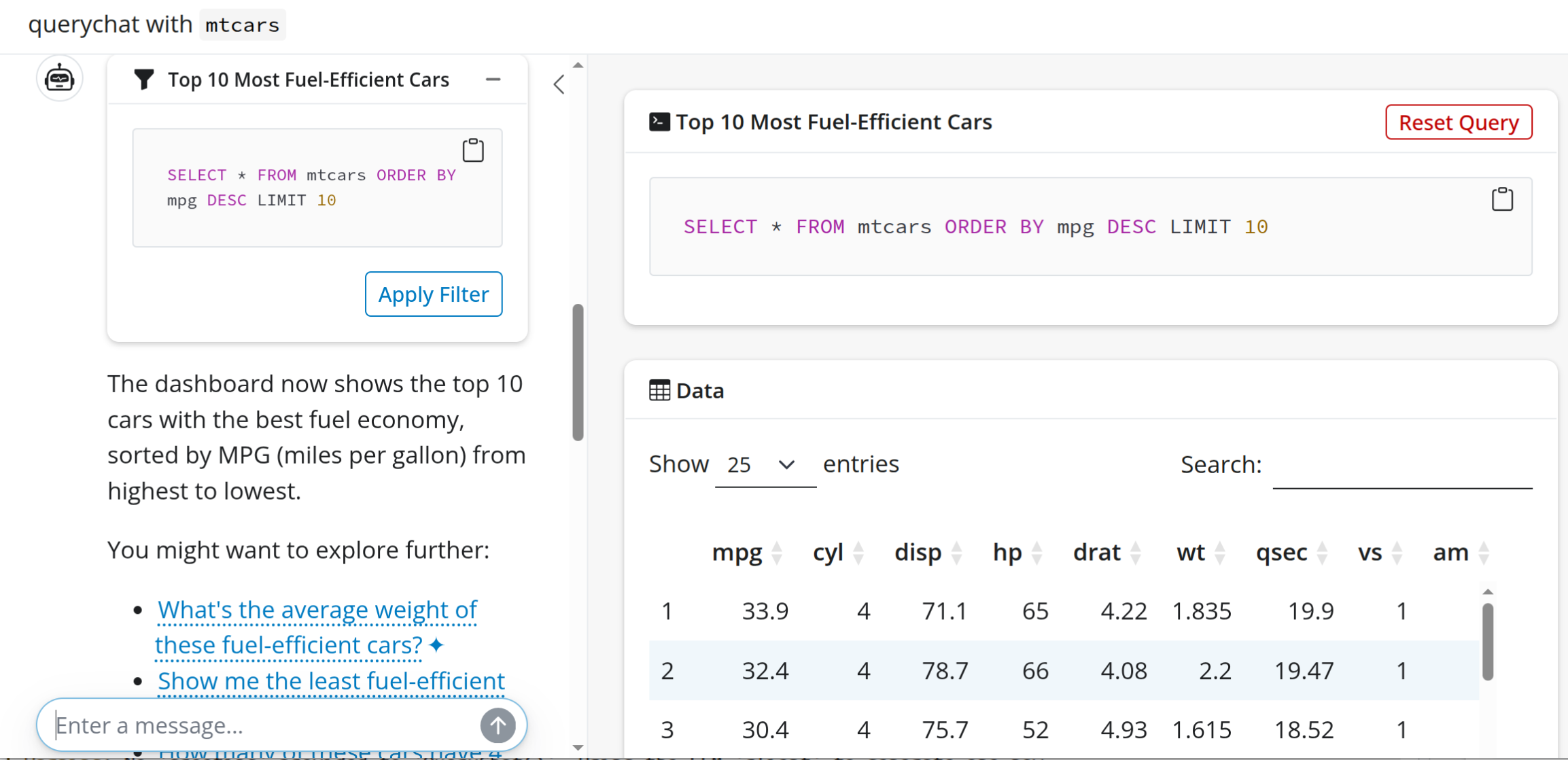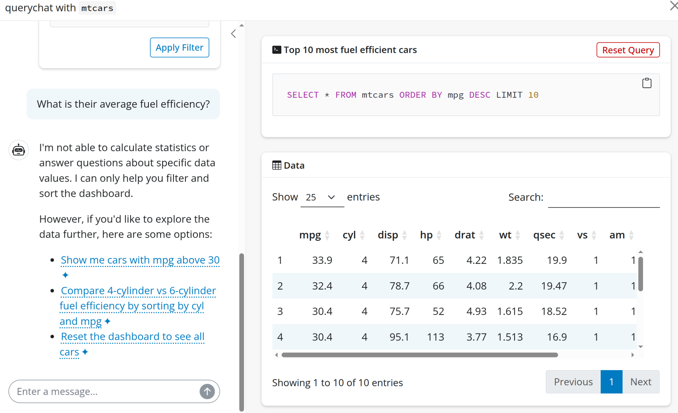 querychat_app(mtcars)Exploring querychat: talk to your data in a Shiny app