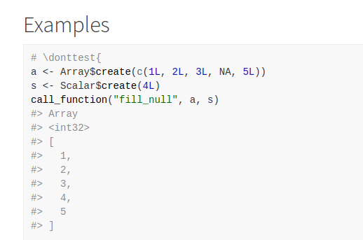 I’m currently working on adding to the documentation of the arrow R package, and I’ve started thinking about the qualities of good examples. Specifically, I’m referring to the examples included as part of function documentation. In my experience, the best way for me to achieve rapid familiarity with an R function I haven’t worked with before, or understand how to use a function about which I already understand the basics, is by having example code that I can run. In the book ‘R Packages’, Hadley Wickham remarks that examples are “a very important part of the documentation because many people look at the examples first” and rOpenSci recommend that each of a package’s exported functions should be accompanied by examples.