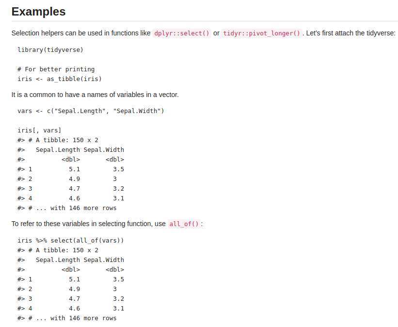 tidyselect::starts_with()and many other examples from that package) - examples should be correct and run without error (unless intended to show erroneous output)