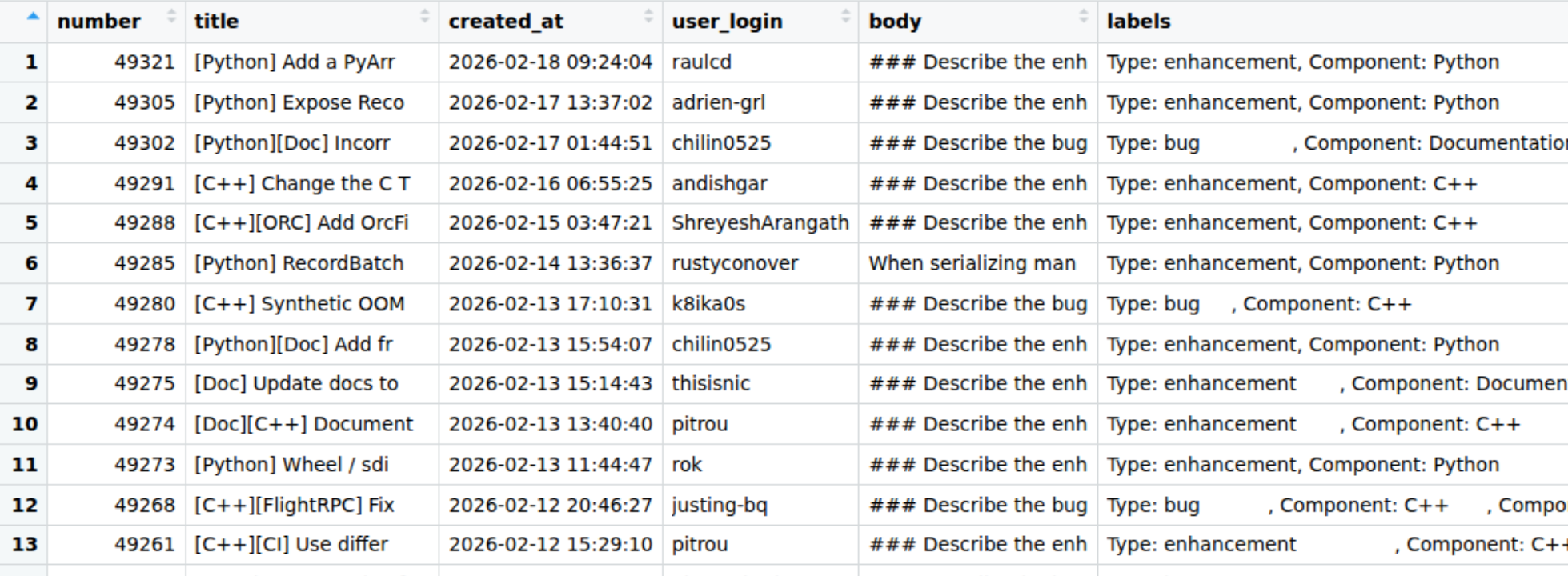 The important column here for us is the labels column, which is a list column containing 0 or more labels. R, Python, and C++ issues all have labels like “Component: Python”. Although the issue titles have the component at the start of their title and also included in their body, this is automatically added based on the label, so isn’t helpful to our problem.