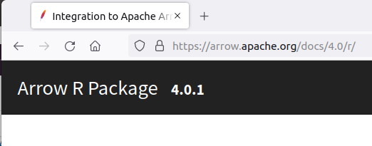 Anyway, the deployed docs only go to the minor version number - so in this case, https://arrow.apache.org/docs/4.0/r/. If we were looking at the docs on 11th April 2021, the pkgdown site would reflect the latest released version of the R package, so 4.0.0.1. If we were looking at that same URL on 29th May 2021, the pkgdown site would then display the latest released version, which would be 4.0.1, as you can see in the example below.