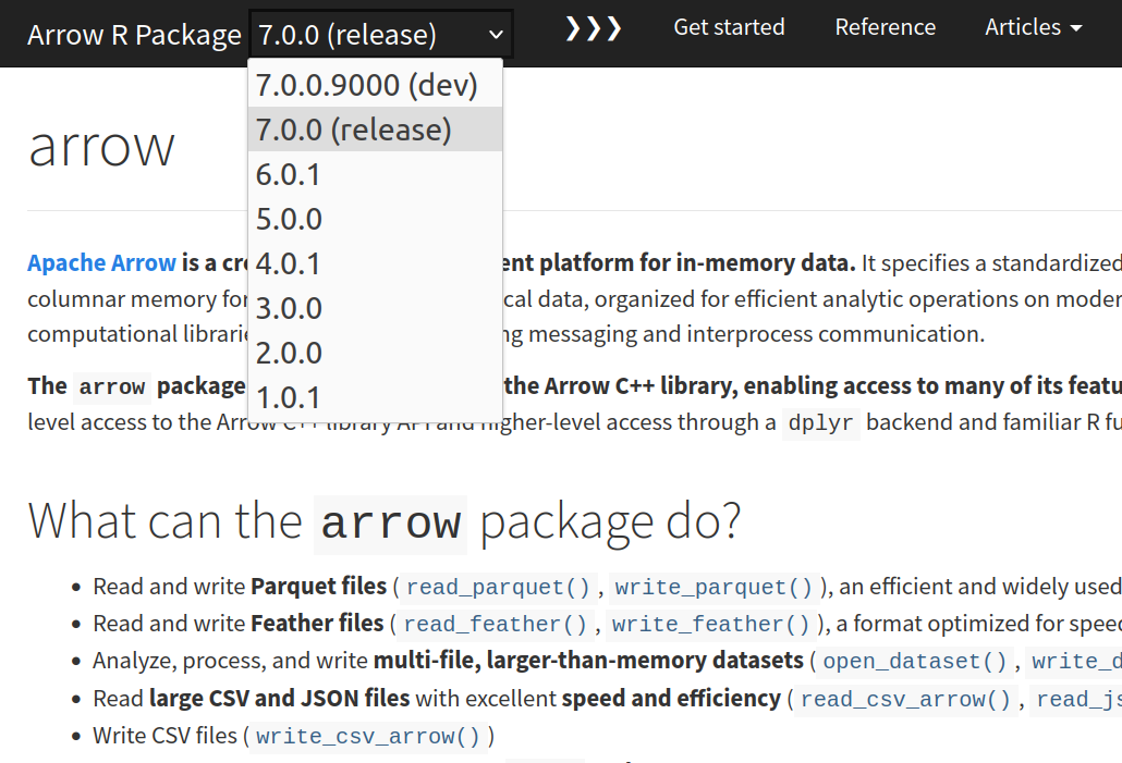 I was excited to work on this feature as its importance is clear to me from my consulting days; I’ve worked with many organisations who have had to lock down versions of R packages they allow employees to install, and so upgrading to the latest version isn’t an option. Arrow is growing and developing as a project, both in terms of internal functionality and nudges to improve package UX, and so the latest docs version may be inaccurate if users are working with a version of the package from 1 year ago, given we do major releases every three months.